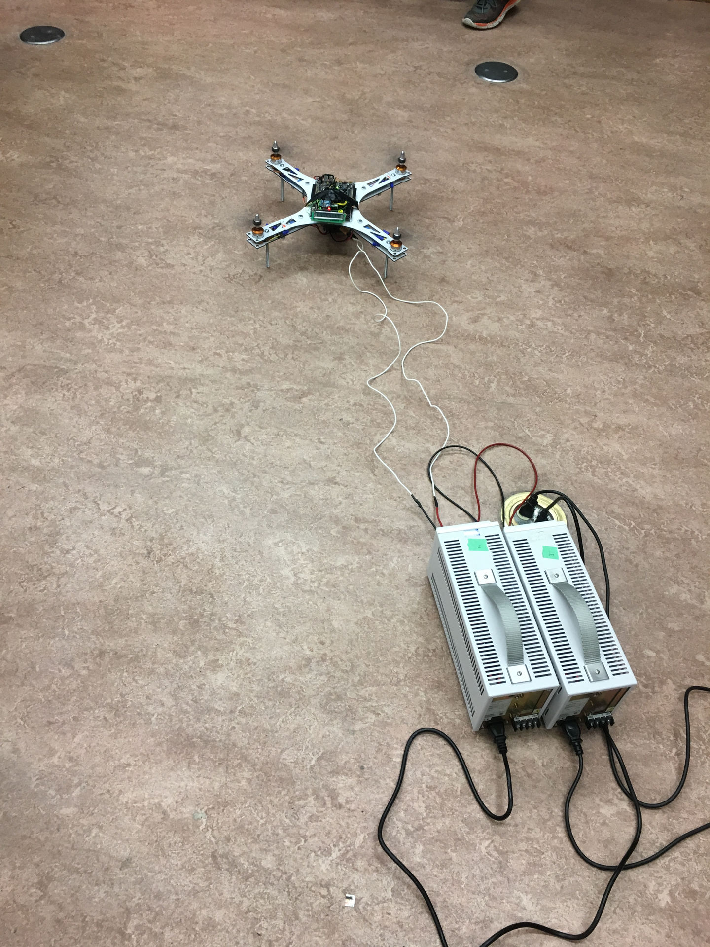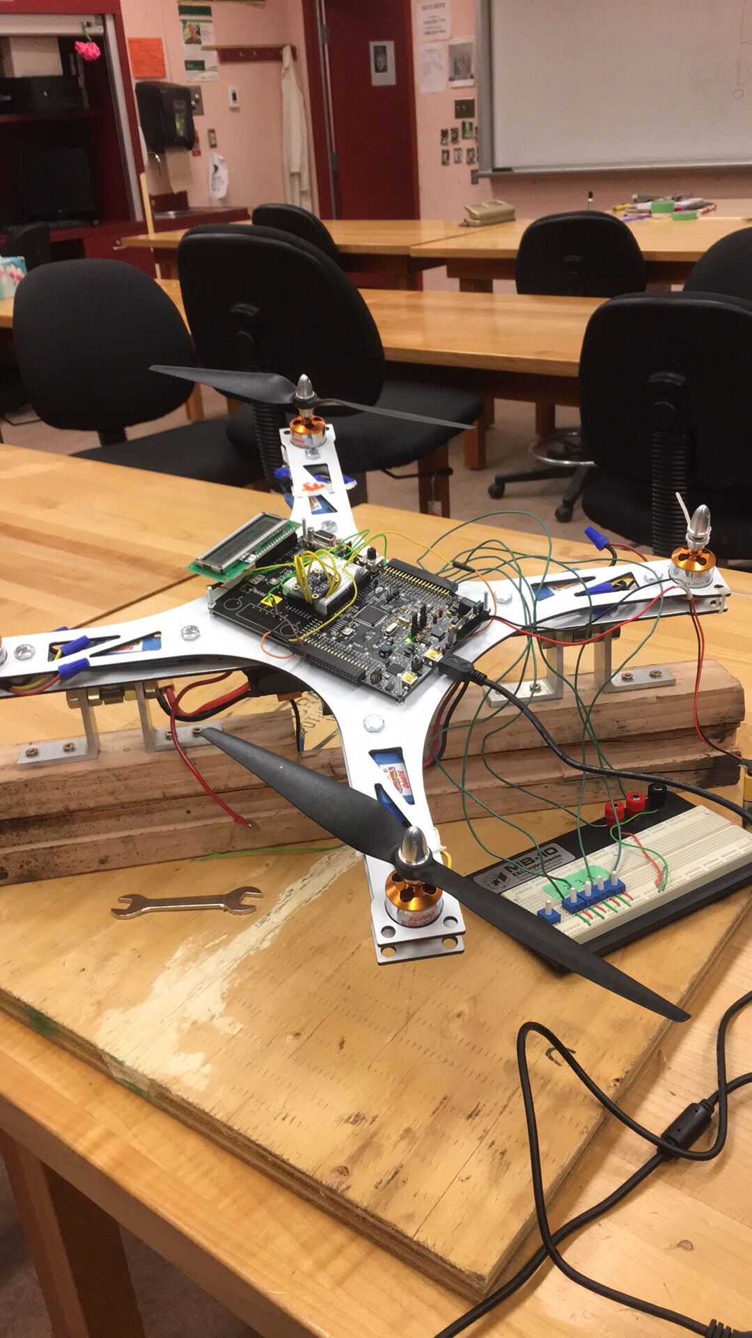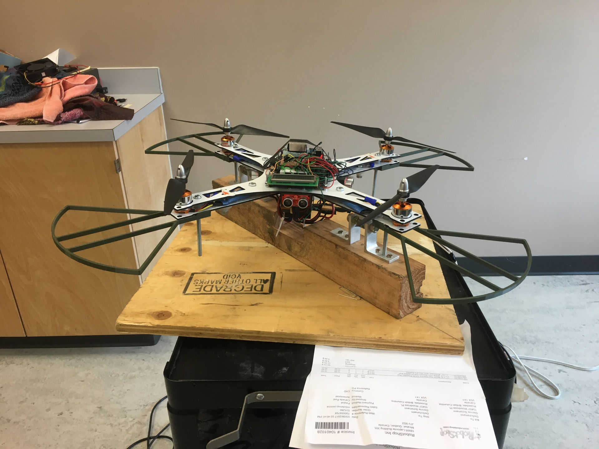 One of my undergraduate projects involved building a quadcopter. My group purchased off-the-shelf components for the rotors, motors, battery, trancievers, and microcontroller, but designed the frame, control system, and handheld controller ourselves. I was responsible for designing the communication protocol and flight controller, and performed most of the tuning and calibration.
